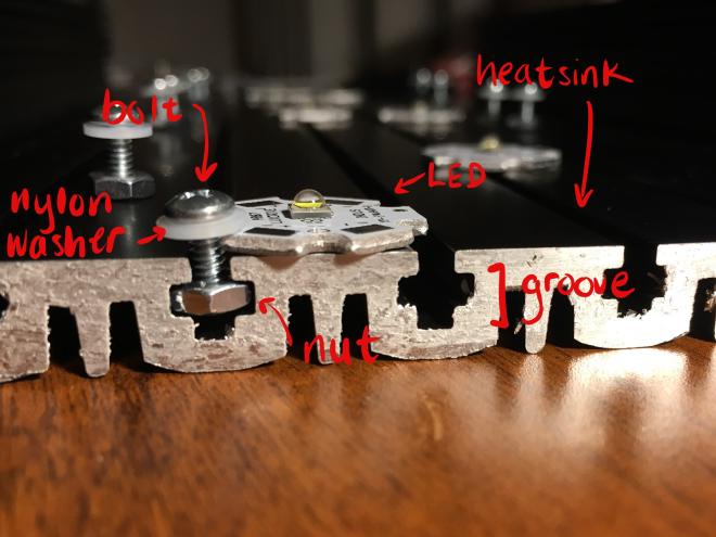 Figure 1. The attachment of the LEDs to the heatsink made use of the grooves of the heatsink. A bolt, nut, and nylon washer clasped the LED in place.