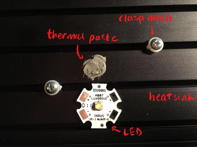 Figure 2. A glob of thermal paste was applied to the heatsink before attaching the LEDs. The clasping mechanism was slid down the grooves (see Fig 1).