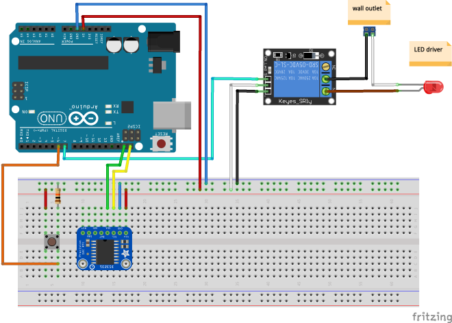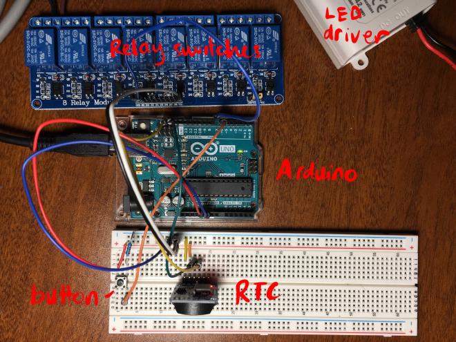 Since taking and posting these photos, I swapped the 8-channel relay for a 4-channel to save space. Also, to make the wiring more compact, I moved all of the components on the breadboard to a proto-shield that fits comfortably on top of the Arduino. The actual wiring connections have remained the same (except I had to access the I2C SDA and SCL connections via analog pins A4 and A5, instead of the designated pins along the digital pin side). I will soon move this more compact system into a project box. I have also added a temperature sensor and a small OLED screen to print the temperature.