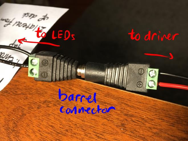 Figure 3. The barrel connection from the LEDs to the LED driver. This connection is + to + and – to –.