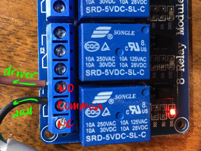 Figure 4. A close-up of the relay switch. Either wire could have gone into the Common and the other into the NO terminal. NC stands for “Normally Closed” which would have the connection On by default.