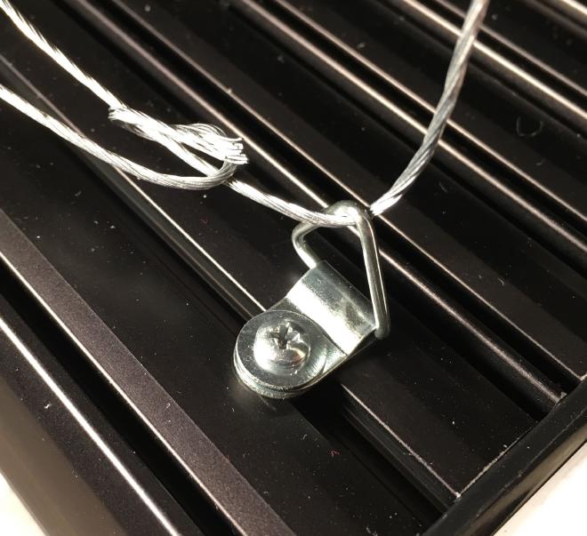 Figure 7. A picture frame wall hanger was attached to the heatsink using the built-in grooves and the included nut and bolt. A washer was placed between the heatsink and hanger and between the hanger and bolt.