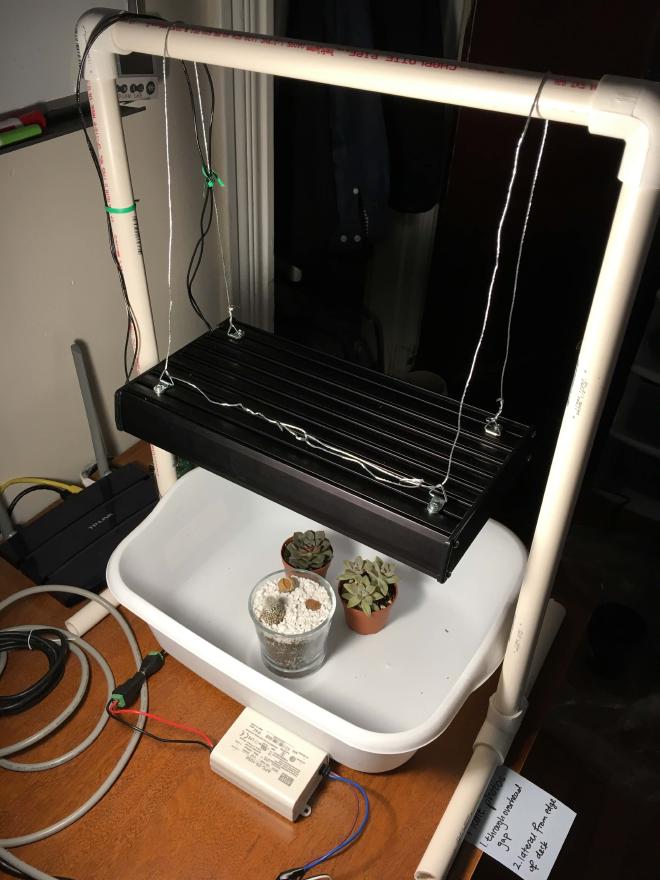 Due to the drastic differences between the natural environment of lithops and Boston, I have to grow the plants indoors and under artificial light. Below is to documentation of how I built my set up. The lights are setup and running, though I am still in the process of assembling the hanging mechanism.